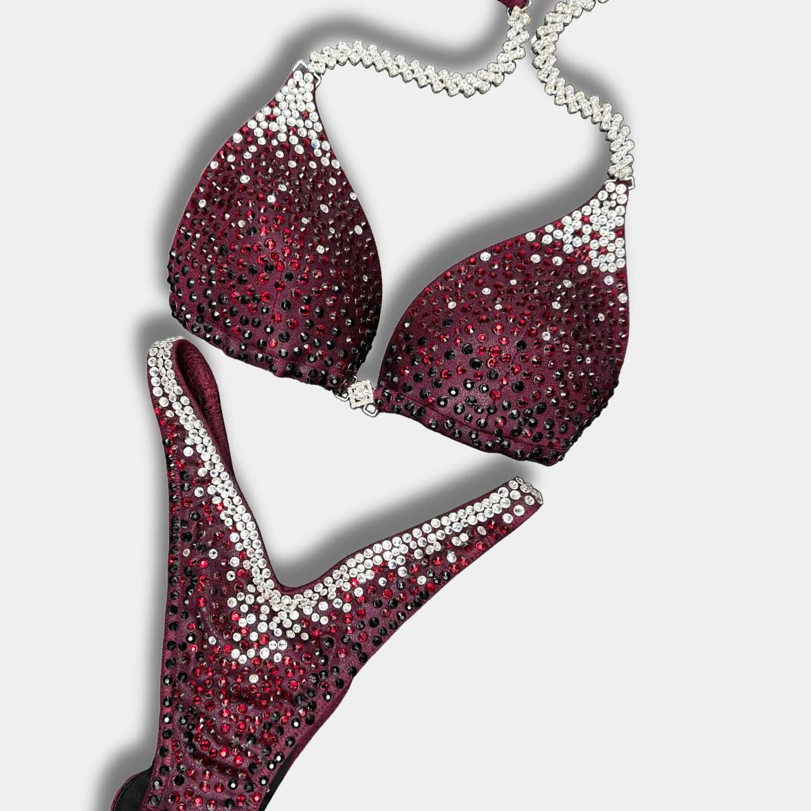 Medium-cover bikini dekoreret med en fade bestående af crystal, mørke røde og sorte Preciosa rhinsten på bordeaux stof.